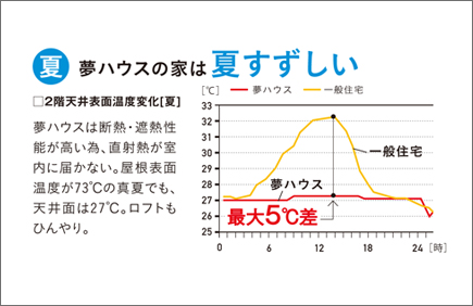 屋根裏や壁にアルミ遮熱シートを設置することで、太陽からの放熱が建物の中に入る前に反射し、室内の温度を低く保つことができます。日中で平均5℃以上の熱を遮ることができるので真夏でもクーラーが要りません。